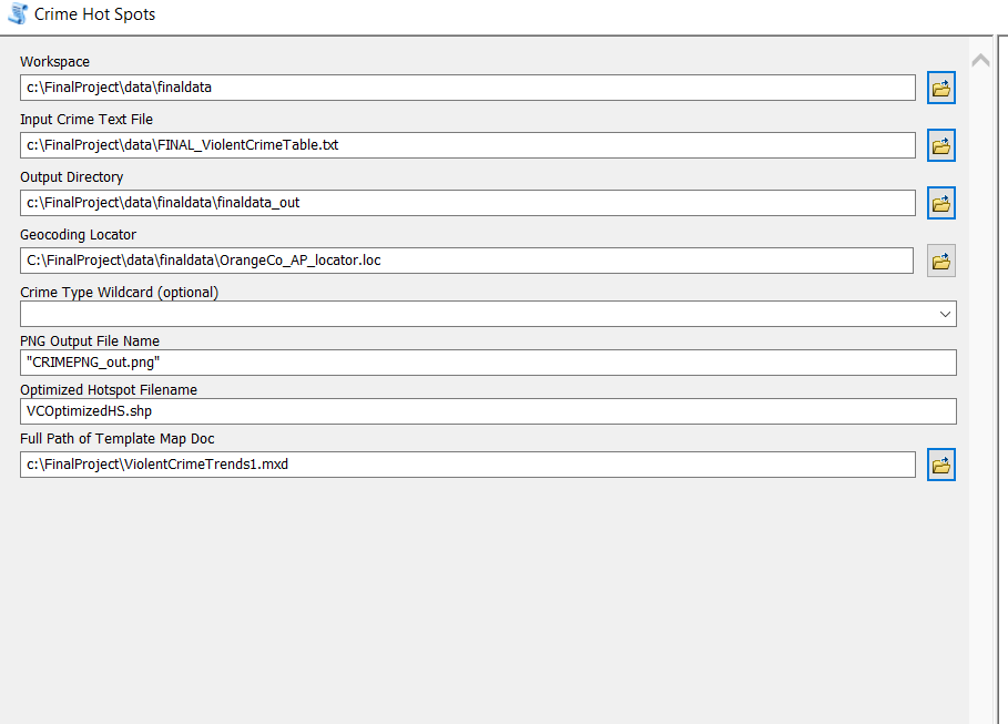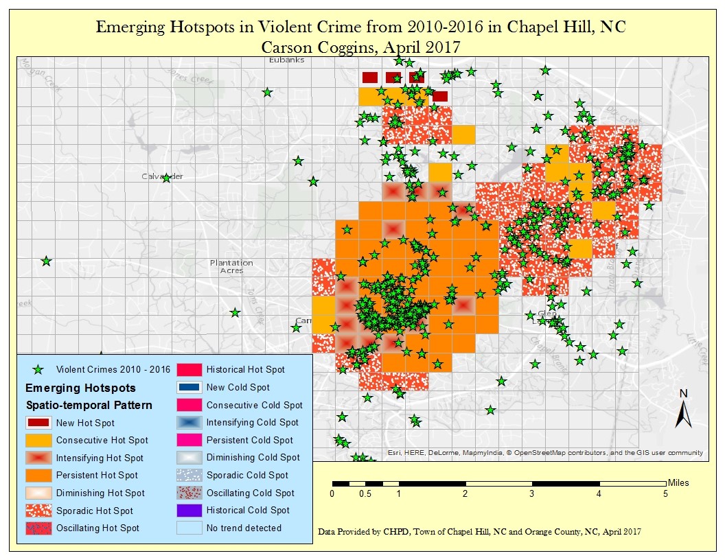 Problem: Monitoring spatial patterns in violent crime, though important, may occur only once a year due data manipulation challenges. Creating crime maps requires preprocessing steps that are time consuming to perform by hand. Batch geoprocessing to automate intake of CSV files containing crime data (or access the online repositories directly for the data), as well as geocoding data and hot-spot analyses of this data, will improve our understanding of violent crime spatial patterns. Automating this process can enable more frequent monitoring of violent crime incidents–on a monthly, weekly, or even daily basis. I have been tasked with creating a tool for this purpose and applying it to violent crime data from the Town of Chapel Hill, North Carolina.