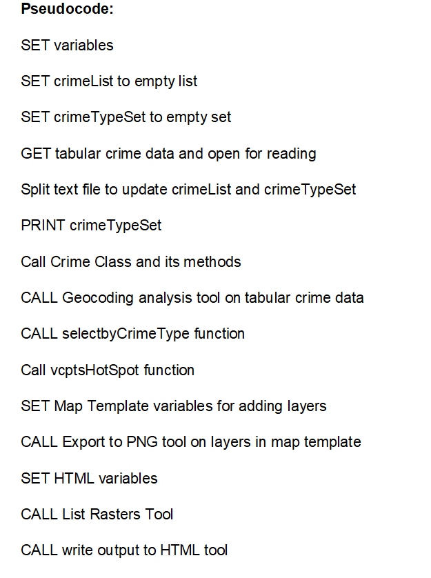 Analysis Procedure: To address the batch processing aspect of the crime pattern analysis procedure, I wrote a series of python scripts featuring a FOR-loop that: for all the types of violent crime in the CSV file of crime data, sets each type as a dictionary key and use those keys to update the ‘master crime table’, ensuring each record in the master table is is categorized by the crime type. Once the master crime table is written, the python script processes address components and Geocodes each crime record to produce a point feature shapefile representing locations of each crime.
