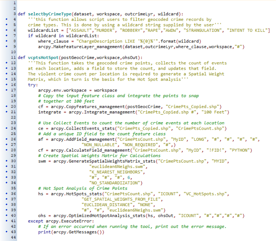 Next a defined function, “selectbyCrimeType” is called which allows the user to filter geocoded crime records by crime type. This function relies on a wildcard string supplied by the user and provides a way for the user to configure the tool to visualize specific kinds of violent crime. Next the script calls a second defined function, “vcptsHotSpot” for the crime point shapefile. This custom function collects crime events, generates a count of events at each geographic location, and uses the count field to generate a Spatial Weights Matrix. This matrix acts as the input for the subsequent Hotspot analysis which is executed by the script before finally generating two HTML reports featuring hotspot analyses- one regular hotspot analysis and one optimized hot spot analysis.