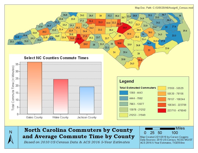 Analysis Procedures: The Census data table utilized to generate the map is compiled from the American Community Survey 5-year Estimates. This data was collected between 2012 and 2016 in efforts to understand important factors in American communities, focusing particularly on commuting rates by gender. The two fields from this csv table I utilized in this project are ‘HC01_EST_VC55 – Total; Estimate; TRAVEL TIME TO WORK – Mean travel time to work (minutes)’, and ‘HC01_EST_VC32 – Total; Estimate; Workers 16 years and over who did not work at home’. I used the total number of Workers over 16 who did not work from home (a/k/a workers who commute) to display the number of commuters per County in NC, and the Average Travel Time to Work as a label for each County as well as a graph showing the high, median, and low travel time values.