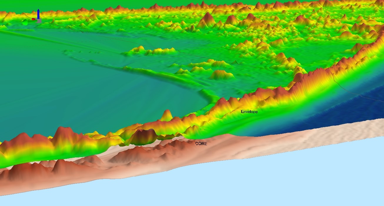 The first image in the results section below depicts the 3D visualization as well as a cross section view of the core and envelope. The 3D image depicts the core and envelope with z=3 to effectively display the surfaces. Another key piece of analysis relies on the 3D Visualization of Historic Shoreline Contour Lines.
