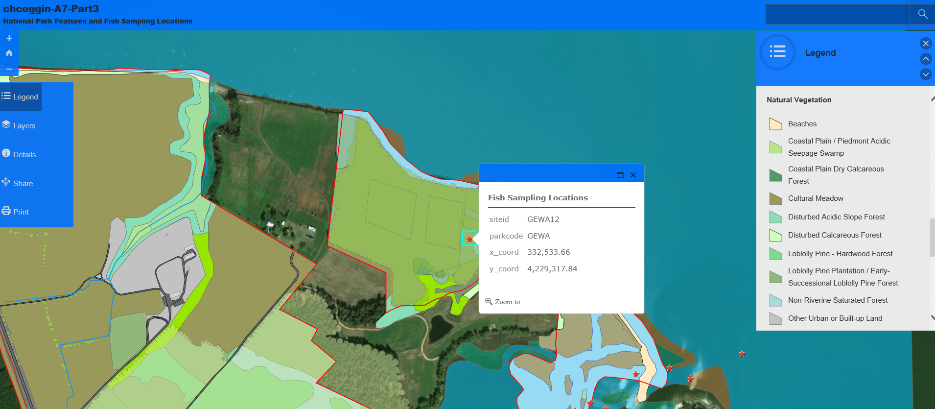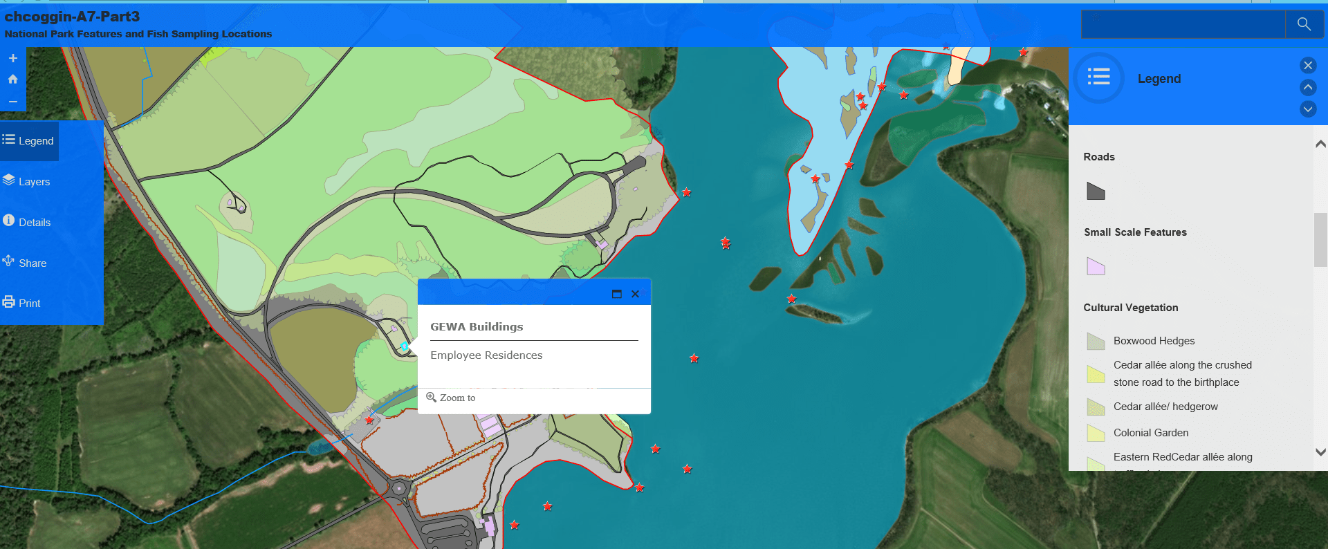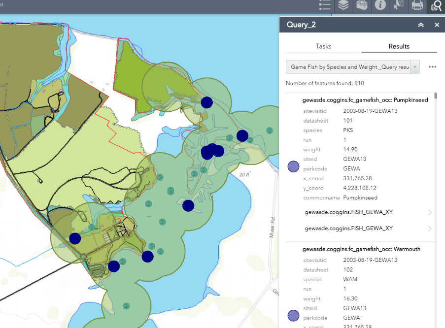 Problem: National Park Service (NPS) employees have requested a Web Mapping Application that provides to edit George Washington Birthplace National Monument (GEWA) fish inventory data housed in an Enterprise Geodatabase. They have requested an editable and published feature service so they may make necessary edits while in the field. They have also requested the final web mapping application utilize customized geoprocessing and query widgets.