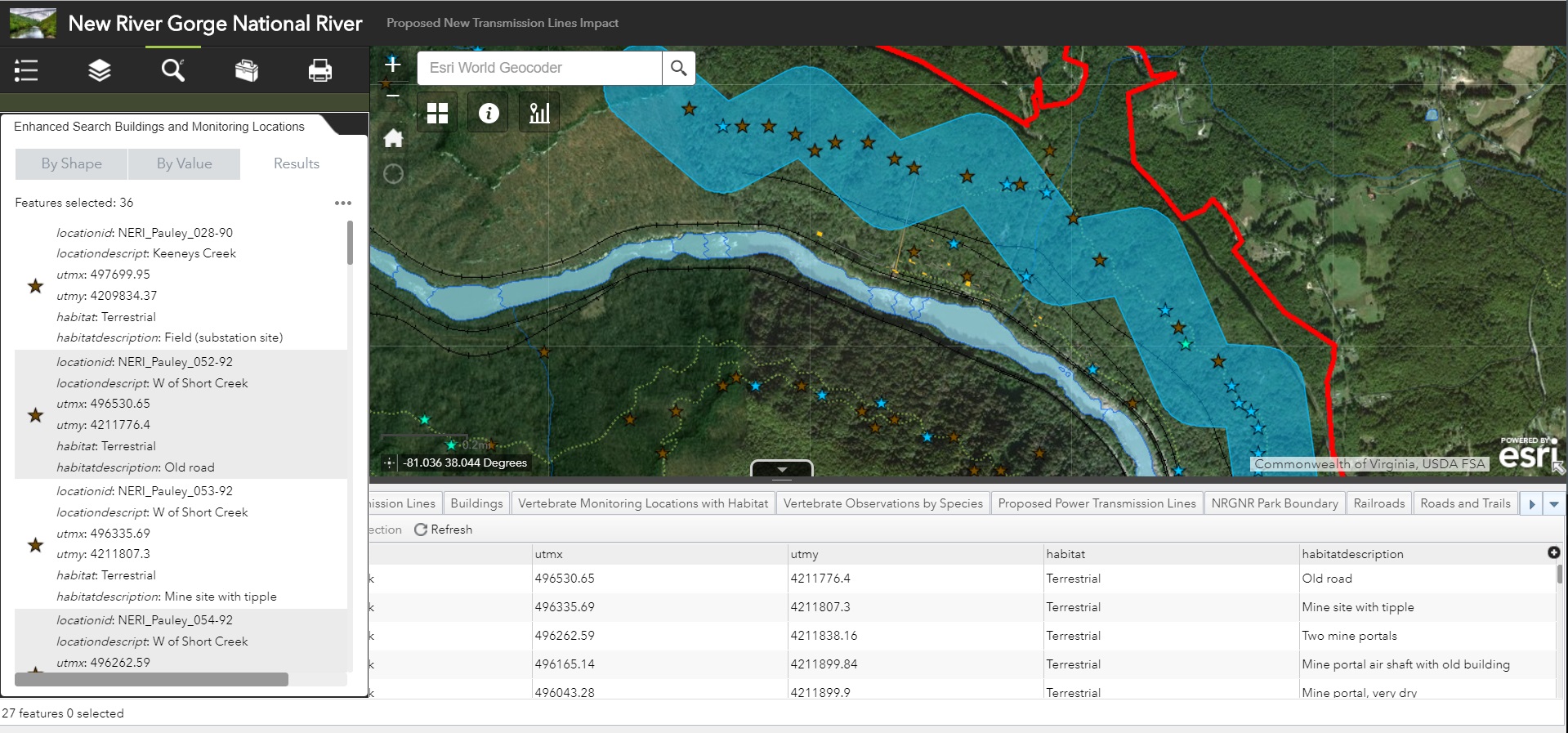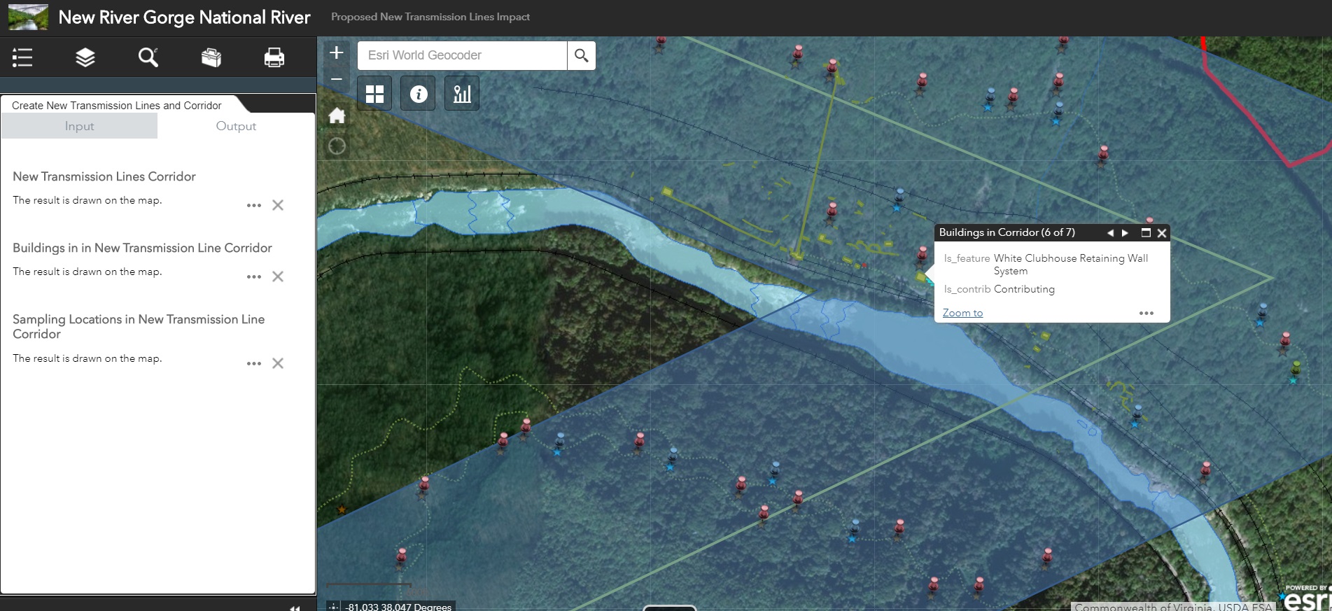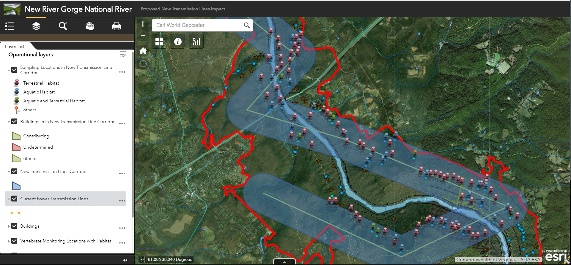 To facilitate this investigation, a web mapping application was developed to provide users with the ability to visualize common factors considered in an impact study including habitat characteristics for specified animal species, culturally significant buildings, and proposed power transmission lines. The application also allowed users to create their own proposed power lines and subsequently returned a buffered area around the new lines for additional assessment of cultural and environmental impact.