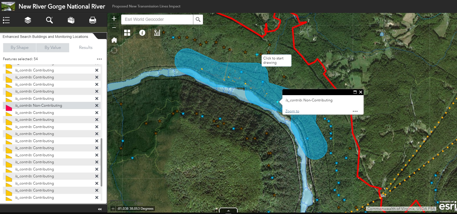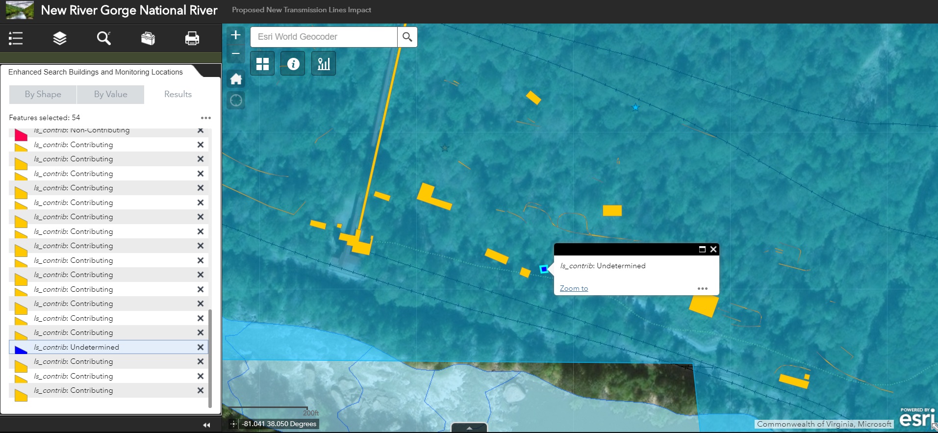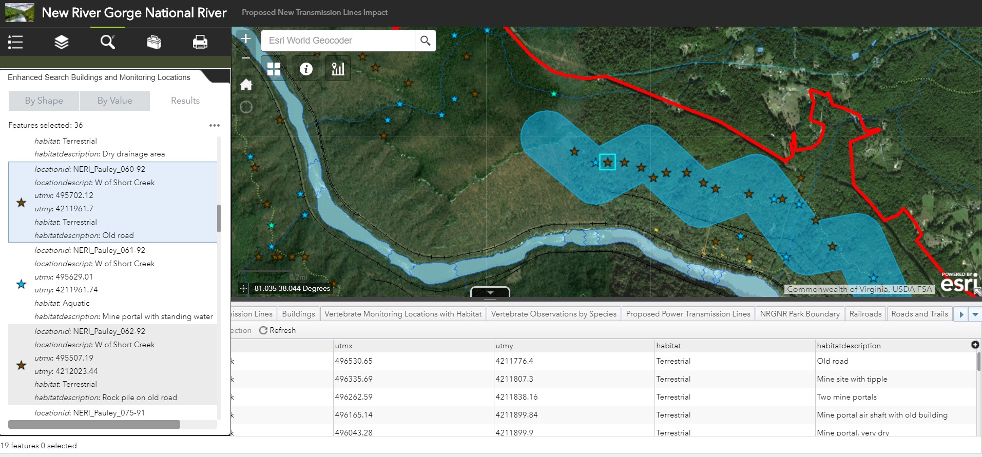 To facilitate this investigation, a web mapping application was developed to provide users with the ability to visualize common factors considered in an impact study including habitat characteristics for specified animal species, culturally significant buildings, and proposed power transmission lines. The application also allowed users to create their own proposed power lines and subsequently returned a buffered area around the new lines for additional assessment of cultural and environmental impact.