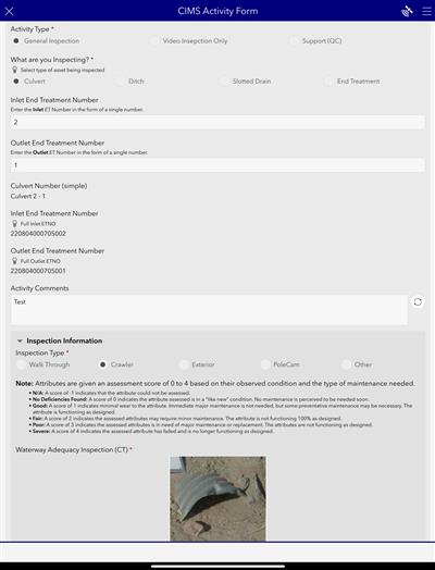 The backbone of the Caltrans Culverts Inspection Management System (CIMS) is the form used to perform the inspection of the asset. This form was designed and configured using ArcGIS Survey123 Connect. The Connect builder was used to accommodate the advanced logic and calculations needed to drive a successful inspection.