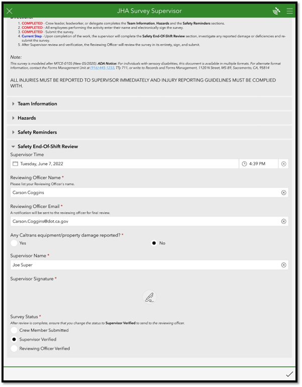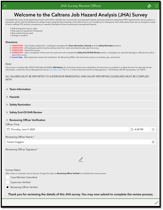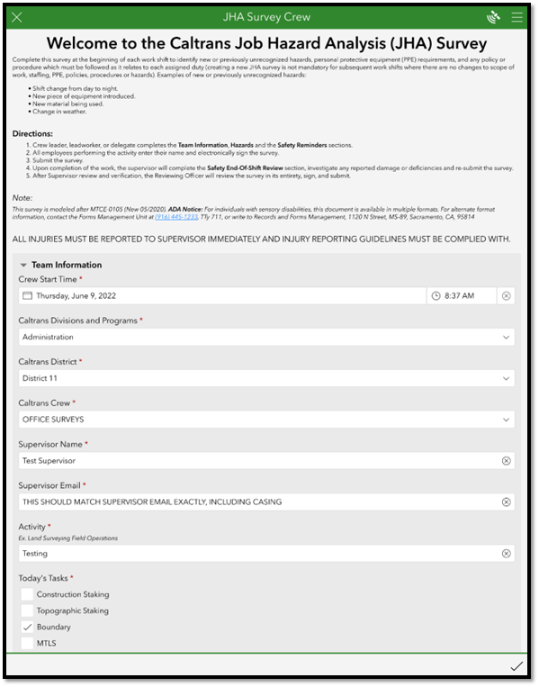 The California Department of Transportation (Caltrans) is responsible for ensuring Land Surveyor Field crews maintain the highest levels of safety standards while completing varies duties in the field. Previously, this was primarily handled through a paper Daily Job Hazard Analysis form that was filled out by Crew Party Chiefs by hand on a daily basis before being submitted at the end of each week.