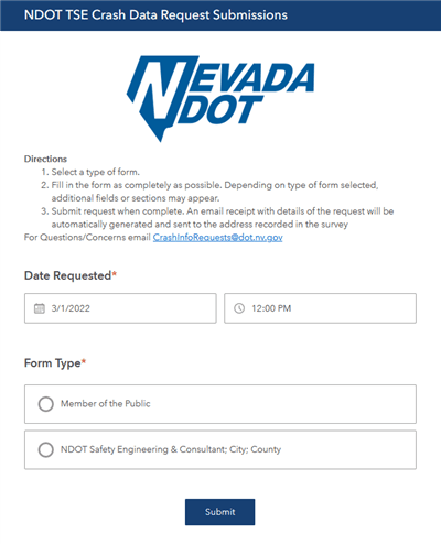 The NDOT Traffic Safety Engineering Crash Data Request Form is a configured Survey123 form intended for use by Nevada citizens and NDOT-affiliated stakeholders when requesting official traffic crash data.
