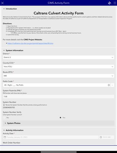 The backbone of the Caltrans Culverts Inspection Management System (CIMS) is the form used to perform the inspection of the asset. This form was designed and configured using ArcGIS Survey123 Connect. The Connect builder was used to accommodate the advanced logic and calculations needed to drive a successful inspection.